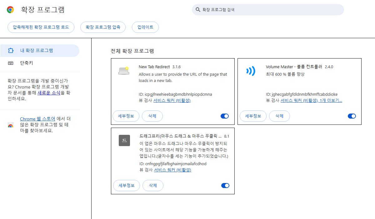 애초엔 유튜브 영상 광고 차단이 목적이었는데, 요즘은 '크롬'은 거의 쓰지도 않고 주로 '브레이브'로 다 하는 처지라서 오늘 무심코 크롬을 열었는데 그냥 시험 삼아서 광고 차단 부문을 다 없애고서 확인해 보려고 한다.