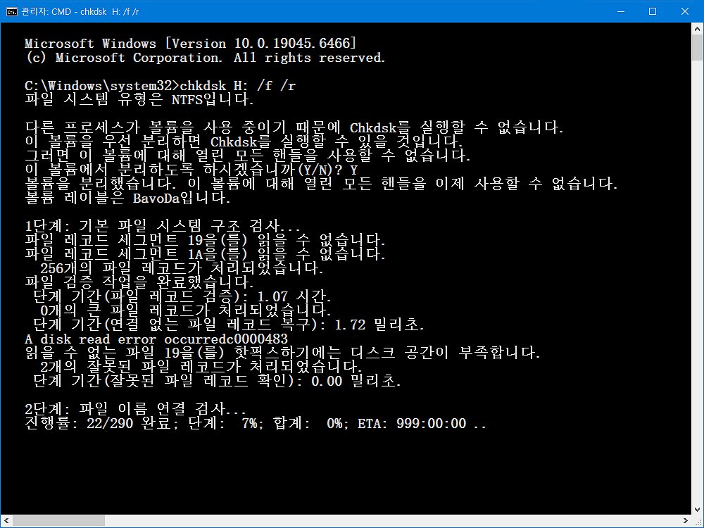 chkdsk [드라이브명] /r: 오류 수정(/f) + 불량 섹터 찾기 + 데이터 복구 시도를 합니다. (1~5단계 모두 실행, 시간 오래 걸림)